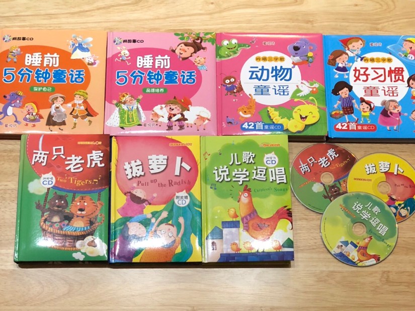 We have a growing collection of CDs/books that we listen in the car every day for 10-20 minutes. On weekends we also listen to Hoop Kids 圈圈 music while doing quiet activities like dot-to-dot and coloring. The longest Chinese sentences that he can speak are lines memorized from songs! Plus it is really cute to hear him singing to himself.