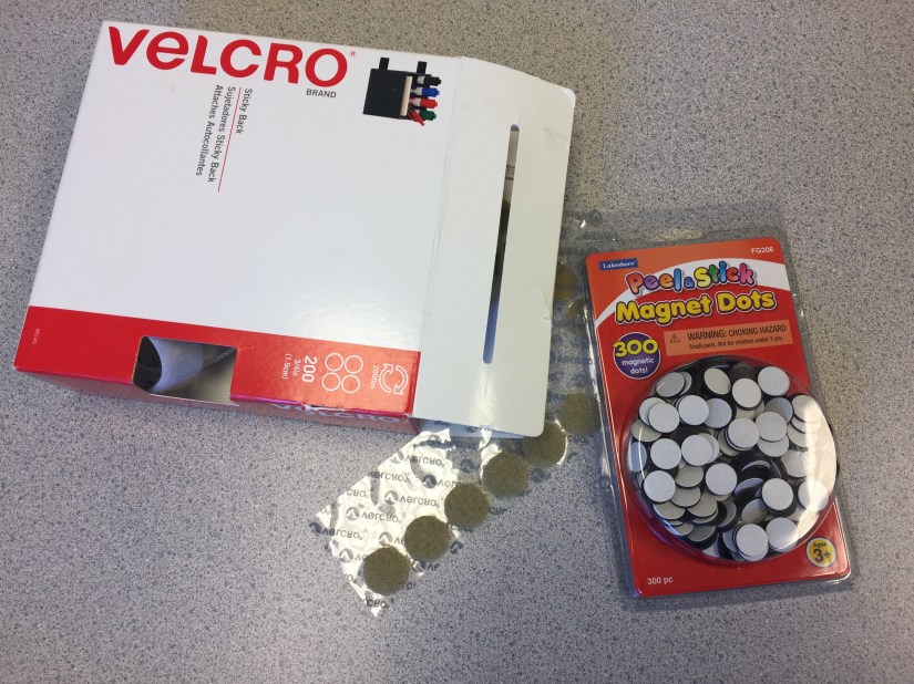 Alternatively you could use magnet dots which are available at Lakeshore for $7.19. They are more expensive than Velcro but you can play with your magnets on other surfaces.