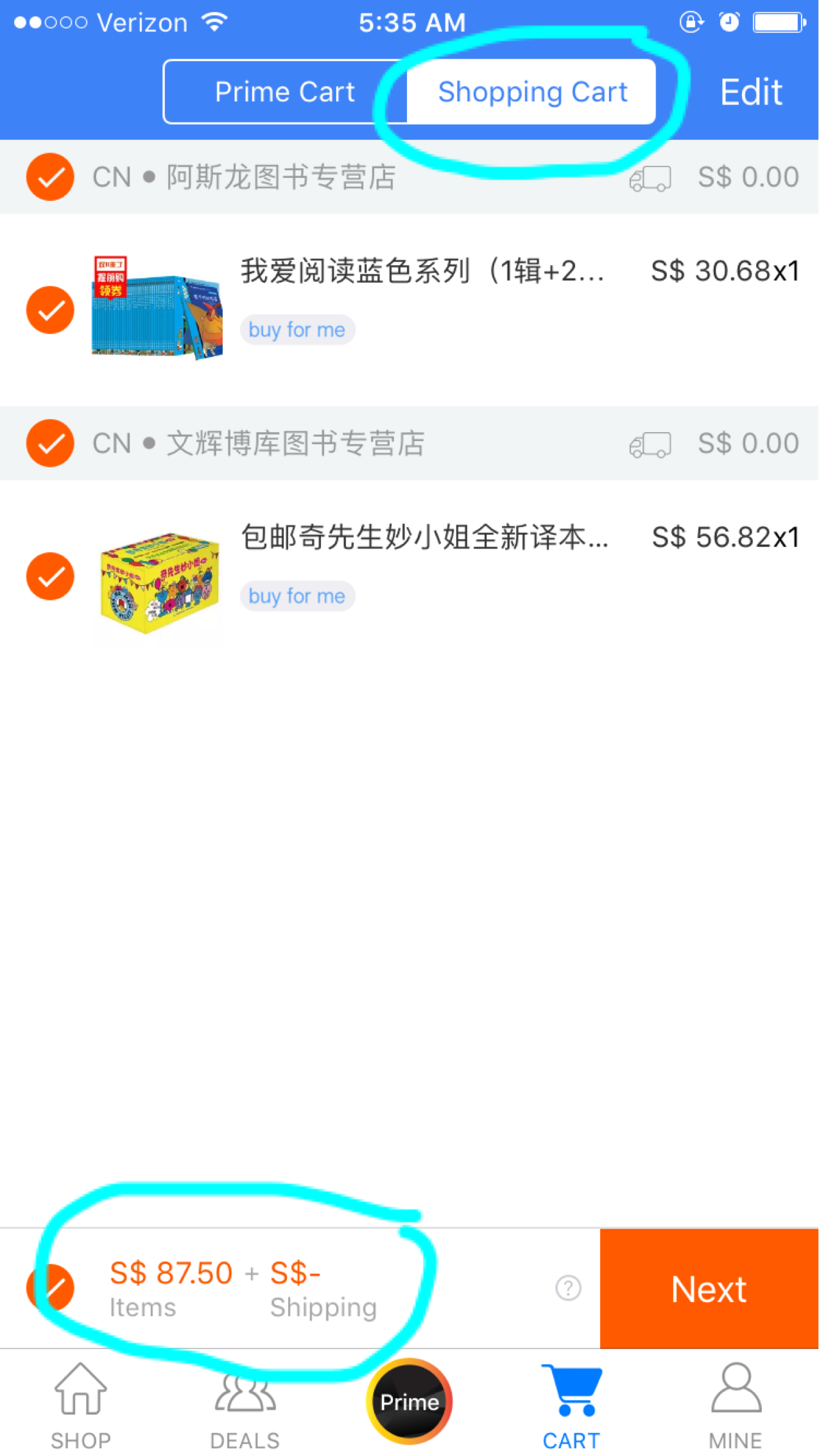 Prime is the cheapest way of shipping books from China and you should most definitely choose Prime if it is available. Click “add to cart” and toggle the button to Prime. Out of the 20 sets of books I wanted, 13 were available on Prime.