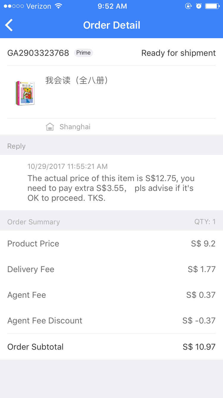 This time, out of 20 items ordered, two of them had issues. Issue #1 was that TB seller increased the price before EZBuy could purchase it for me. In this case I decided to proceed with the order and “top up” the extra few dollars.