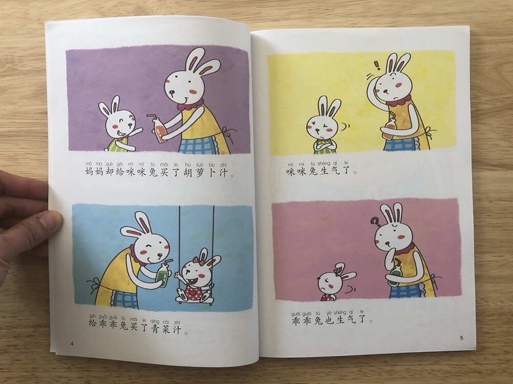 Don’t spend too much of your time reading these to your kids. Compare a sentence in a reader “乖乖兔也生气了” (Good Bunny is also angry) to a sentence from a picture book “找到球了,入室盗窃案好像也一起侦破了” (After we find the ball, the burglary case will likely be solved as well). Which one has advanced vocabulary and sentence structure that you want your kids to learn? The answer should be obvious.